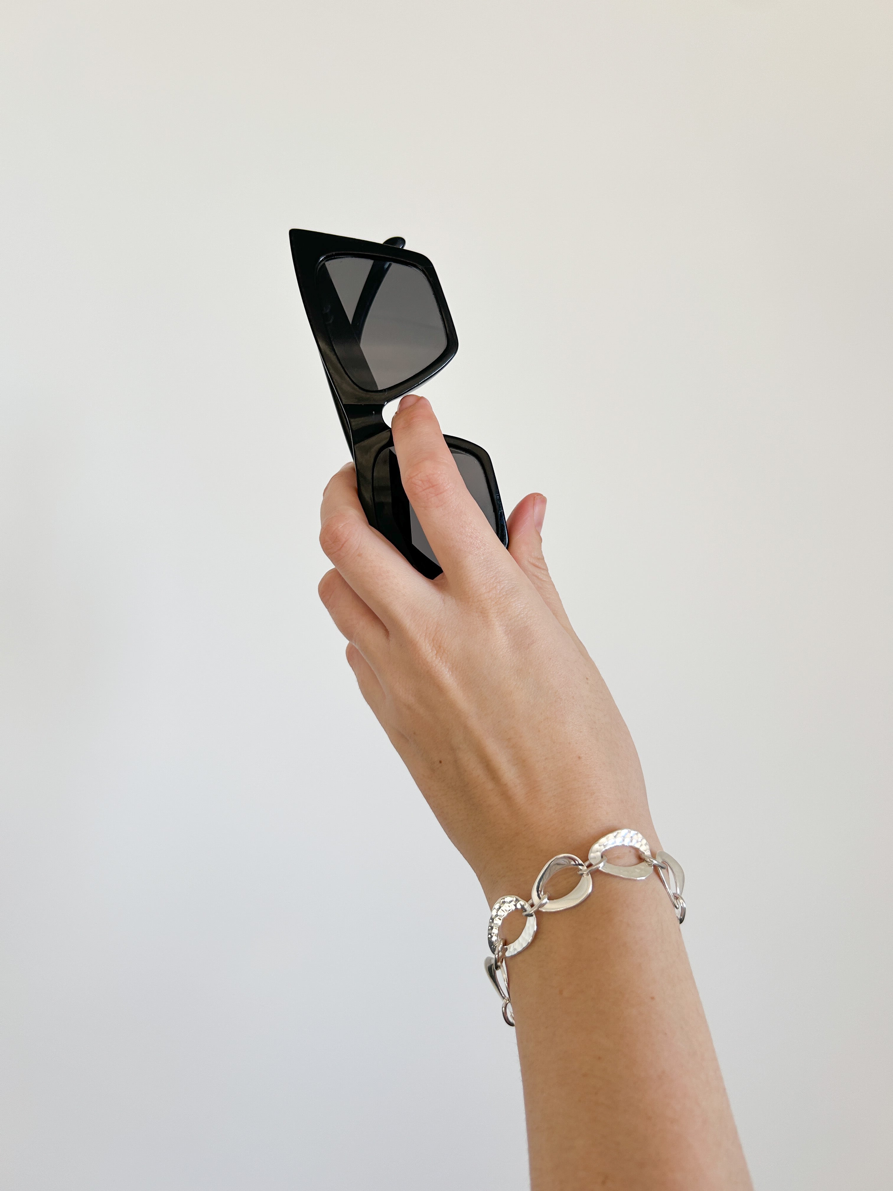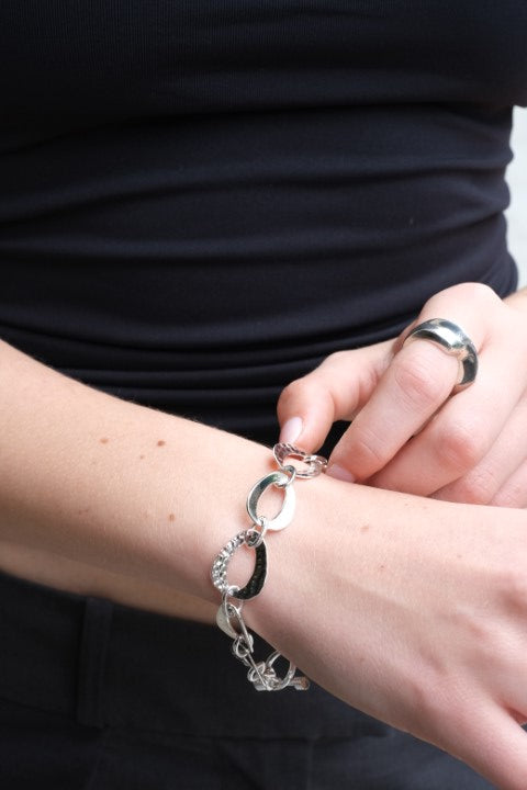 Experience pure luxury with this stunning bracelet featuring a line of hammered triangles for a unique textured look. Made of high-quality sterling silver, this bracelet fastens with a toggle clasp and is adjustable for the perfect fit. Don't miss out on this exquisite gift, packaged beautifully in a gift box. Length is approx 19cm.