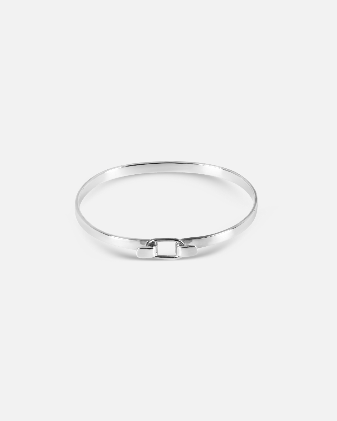 Indulge in the versatile accessorizing opportunities of this stylish Andea bangle in stunning sterling silver. With its sleek design inspired by a belt buckle, this bangle features a solid texture and a unique square cut-out. Keeping it secure is a convenient hook clasp.