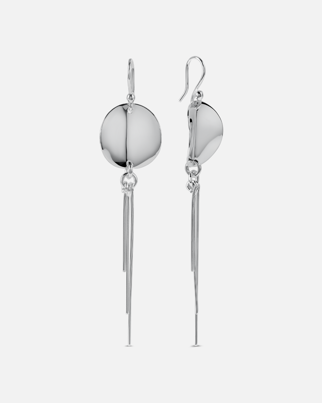Complete your look with these Round Disc Three Rod Earrings. These earrings feature a unique design with three rods attached to a round disc, adding a touch of sophistication to any outfit.